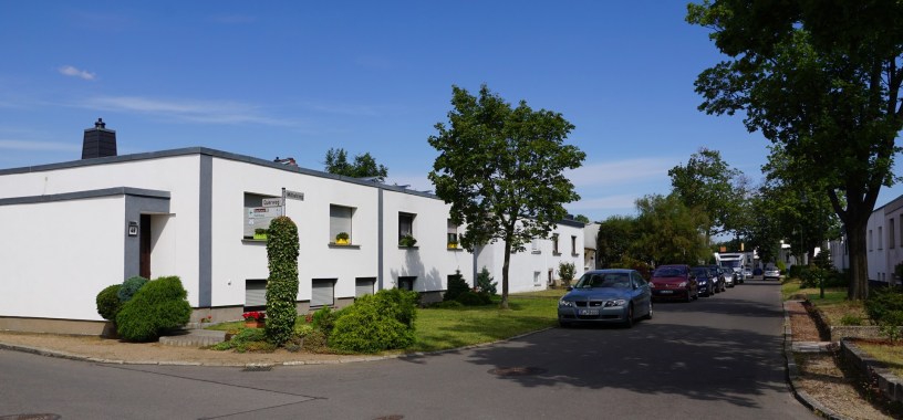 Die Siedlungshäuser stehen im Stadtteil Törten der Stadt Dessau-Roßlau.