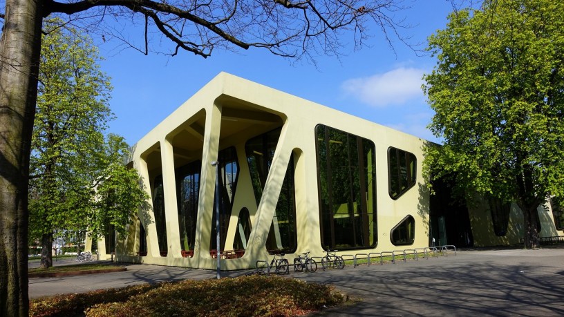 Im Sommer bietet die große Dachterrasse eine einzigartige Aussicht auf die Grünflächen hinter dem Gebäude und den Hochschulcampus. Mit der hellgrünen Farbgebung hebt sich das Gebäude auffällig von der eher traditionell bebauten Umgebung ab. Durch die großen Bäume im Umfeld entsteht für die Mensa eine gewisse Eigenständigkeit, ohne jedoch als Fremdkörper zu wirken.