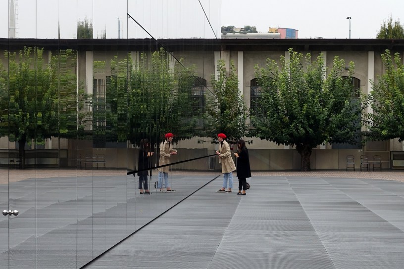 Ein gewachsenes Städtchen in der Stadt war der Anspruch, eine Stätte der Begegnung mit der Kunst der Prada-Stiftung als Ankerpunkt. Plötzlich war die marode Gebäudestruktur der alten Fabrik viel mehr als eine Kulisse. Die kleinen Kontorhäuser und auch das zentrale Gebäude der Produktion bekamen eine neue Funktion. Die Reihe der spitzgiebligen Lagerhäuser war ideal für kleine separate Ausstellungsräume. Etwas neues musste natürlich auch noch rein. Koolhaas ist ein Verehrer des Bauhaus-Architekten Mies van der Rohe und seiner Berliner Neuen Nationalgalerie. So verwundert es nicht, dass er in Anlehnung an diesen Bau eine große, gläserne Ausstellungshalle mitten in das Gelände integrierte. Zu dominant sollte die Halle nicht werden. Er versteckte den Bau hinter einer großen Spiegelfassade, die die alten Gebäude der Fabrik in die Fenster projiziert. Hier können sich die Besucher auch selbst begegnen.