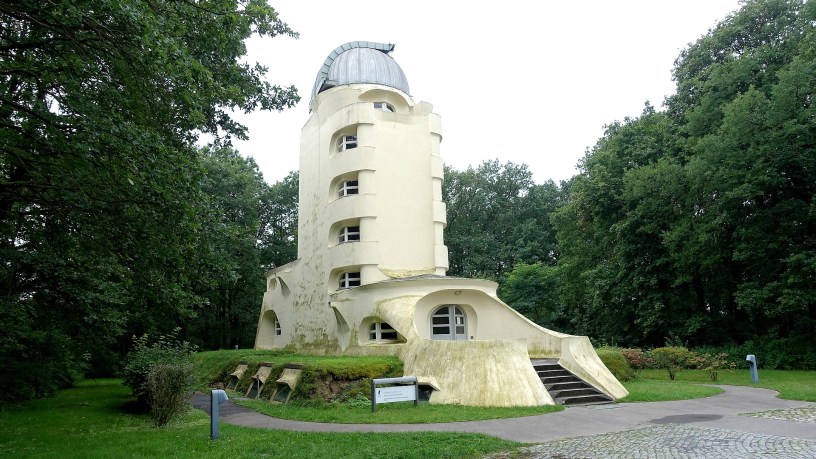 Die abgerundeten Formen scheinen dem Schiffbau entsprungen zu sein. Es finden sich aber auch Bögen, die dem Wiener Jugendstil entstammen könnten. Die Fensteröffnungen nehmen die abgerundeten Balkone der Bauhaus-Architektur vorweg. Und doch verschmilzt alles zu einer ausgewogenen, organischen Form. Der Bau sollte ursprünglich als Beton-Monolith ausgeführt werden. Leider war zur Bauzeit 1919-22 die Verschalungstechnik noch nicht soweit entwickelt, um die runden Formen in Beton zu gießen. So b-steht der Bau zum großen Teil aus Mauerwerk. Die homogene Form wurde durch den Auftrag eines Spritzputzes erreicht. Der Einbau der Instrumente erfolgte bis 1924. Das Einsteinturm genannte Observatorium ist bis heute in Betrieb.