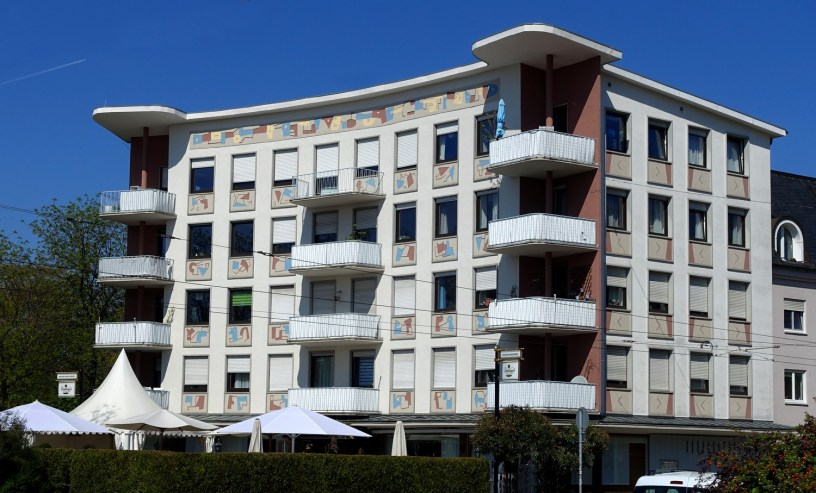 Danke für den Kommentar. Ja, die Sgrafitti-Verzierungen unter den Fenstern sind aufwendige Handwerksarbeit. Die werden mit der Hand aus dem mehrlagigen noch nicht abgebundenen Putz herausgearbeitet. Und bei den Beton-Dächern über den Eckbalkons kommt es auf den Blickwinkel an. Ich finde, dass diese „Ohren“ dem Haus erst richtig den Chrakter geben.