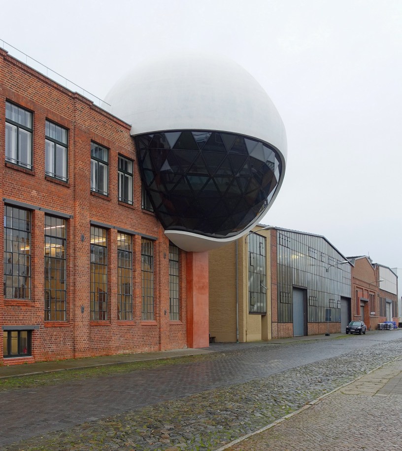 Für einen Leipziger Industriellen entwarf Oscar Niemeyer einen Aufsatz auf das Kantinengebäude von 1927. Größer hätte der Kontrast zwischen dem Backsteinbau und der futuristischen, weißen Beton-Kugel nicht sein können.
