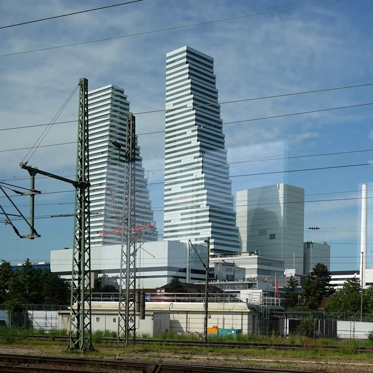 Das Panorama der Altstadt von Basel wird überragt von den Türmen des Münsters. So war es lange Zeit und so ist es auch heute noch, zumindest von der nördlichen Rheinseite aus gesehen. Schaut man auf die Rheinseite gegenüber, sieht es anders aus. Plötzlich überragen da zwei weiße Türme die kleinteilige Stadtansicht. Die Türme sind mehr als 100 Meter höher als das Münster und immer noch über 50 Meter höher als das bisher höchste Gebäude in der Schweiz. Egal von welcher Seite man kommt, die Türme beherrschen das Stadtbild. Als die Planungen 2006 begannen, sollte ein Turm in der Form einer Doppelhelix entstehen und selbstbewusst das Geschäft der Biopharma-Firma F. Hoffmann-La Roche repräsentieren. Auch wenn Roche schon seit den 1930er Jahren viel Wert auf repräsentative Architektur legt, war der Aufschrei groß. Nicht die projektierte Höhe von 160 Metern war damals der Stein des Anstoßes, sondern die zur Schau getragene Dominanz des Entwurfs für den Verwaltungsbau.